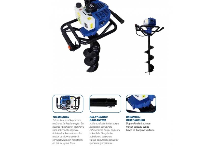 hyundai hyd520 benzinli toprak burgu makinası sert ve kuru topraklarda dahi yüksek verim ve performans ile çalışmak üzere özel olarak geliştirilmiştir. güçlü motoru ve dayanıklı şanzımanı ile hem düz hem de engebeli arazilerde her türlü çukur açma işi için idealdir.