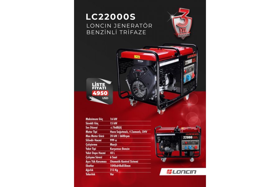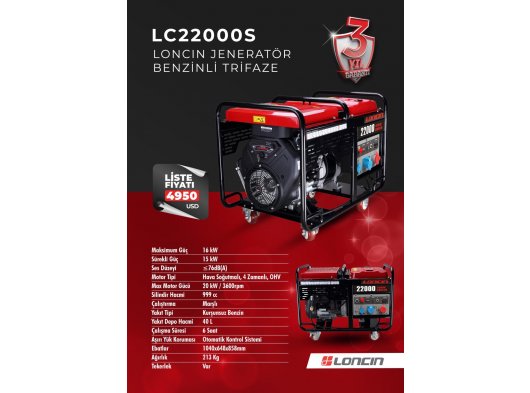 Jeneratör otomatik çalıştırma sistemi ATS (Otomatik Transfer Anahtarı) ile donatılmıştır; standarda göre bu sisteme ATS (otomatik transfer anahtarı) adı verilir. Elektrik kesintisi durumunda bu sistem jeneratörü otomatik olarak çalıştırır. AVR kontrol ünitesi ayrı olarak sağlanır. Jeneratör, istenilen yere taşınmasını kolay ve rahat hale getiren dört adet yüksek kaliteli tekerlekle donatılmıştır. Bu modelin temel avantajı oldukça makul bir fiyata yüksek gücüdür. Bu modeli, güç ekipmanı pazarındaki diğer oyuncular tarafından üretilen benzer modellerle karşılaştırırsak, Loncin LC22000S jeneratörü neredeyse her bakımdan çizgide tartışmasız liderdir.