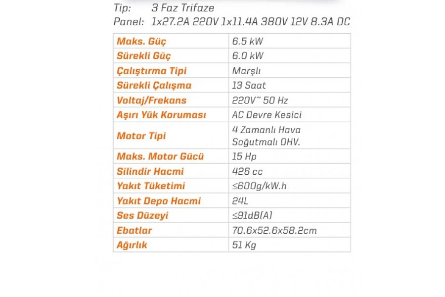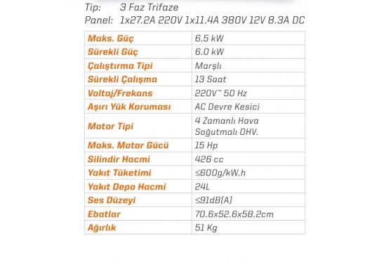 91 dB(A) ses seviyesi ile çalışırken nispeten sessiz olan bu jeneratör, çevresel gürültüyü minimum düzeyde tutarak kullanıcıların ve çevredeki kişilerin konforunu sağlar. Ürün ölçüleri 70.6 x 52.6 x 58.2 cm olup, 51 kg ağırlığı ile taşınabilirlik ve depolama kolaylığı sunar. Bu jeneratör, benzinli jeneratör kategorisinde yer almakta olup, hem taşınabilir hem de sabit kullanımlar için mükemmel bir seçenektir. Orac OJ8000E3, enerji ihtiyaçlarınızı karşılamak için güvenilir bir çözüm sunarken, dayanıklı yapısıyla uzun ömürlü bir kullanım vaat eder